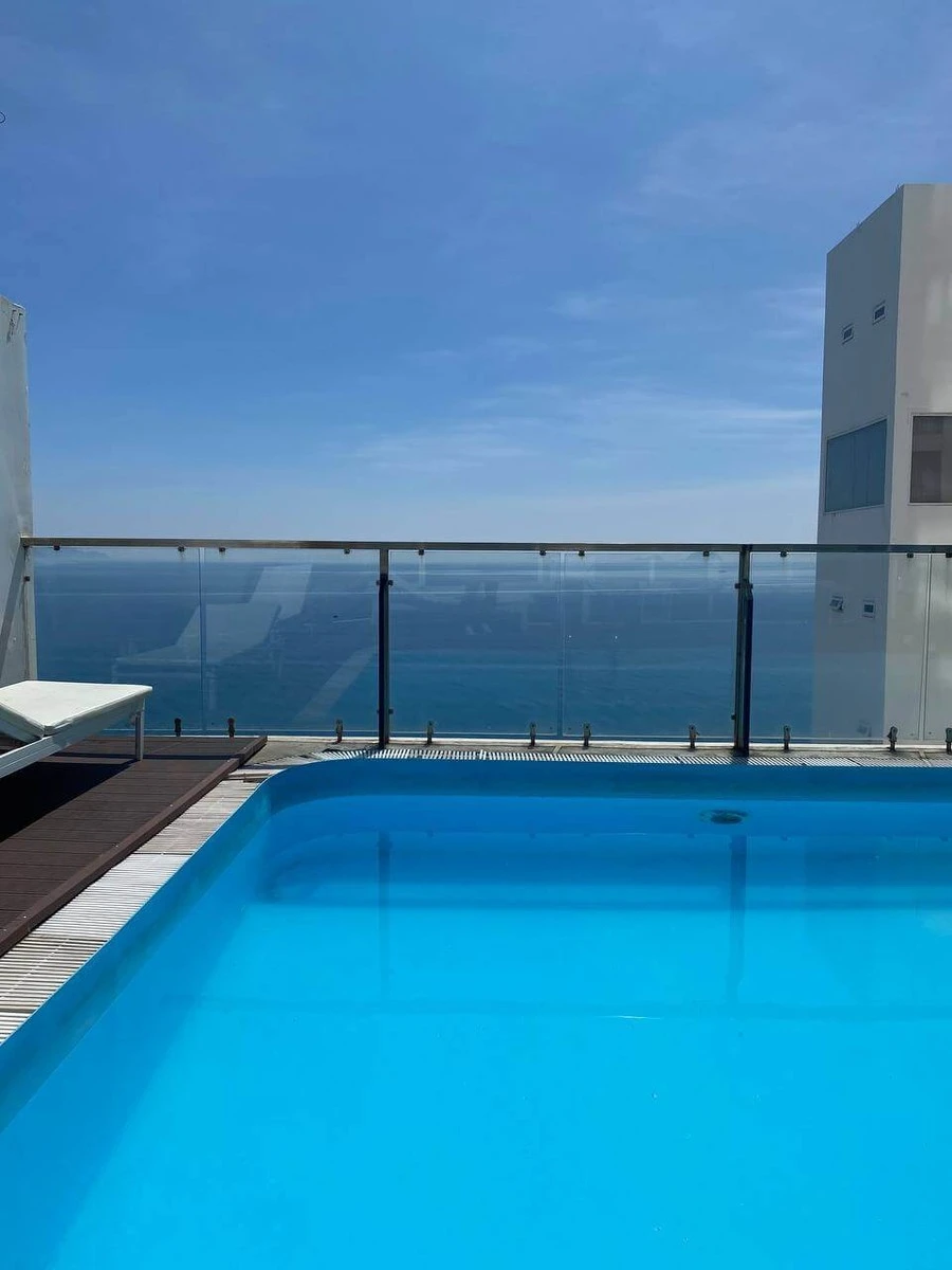 Компактный симпатичный бассейн на крыше на 8 этаже с видом на море, красивый, чистый. Работает до 24:00, здесь же бар. 🥂
