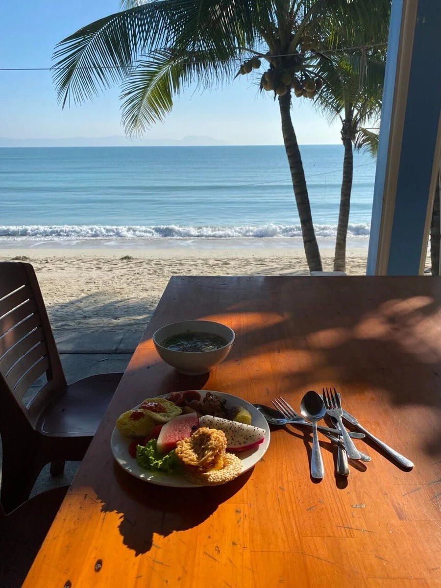 Прямо на выходе из отеля есть кафе: здесь очень вкусно готовят окуня на костре за 150000 донгов, а также самые вкусные манговые смузи 👍.