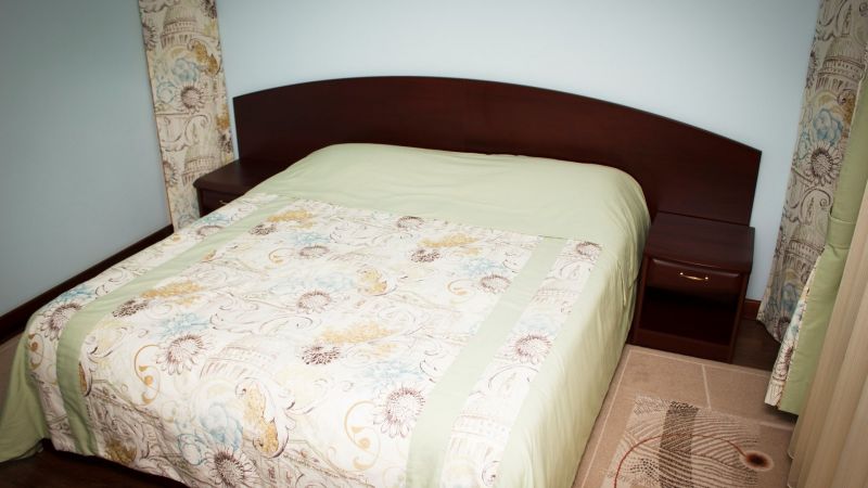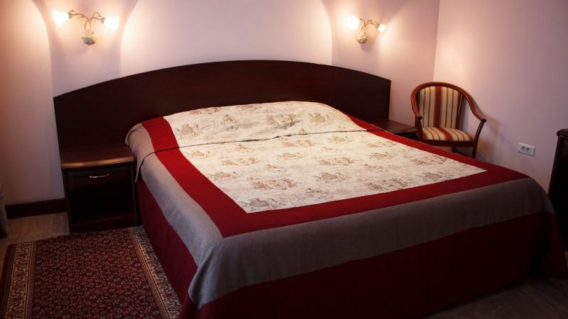 - ЛюксДвухкомнатный номер: двуспальная кровать, мягкий диван и кресла, телевизор, холодильник, санузел с душевой кабиной. Площадь номера — 35 кв. м.
