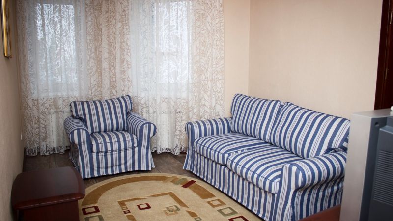 - Полулюкс Двухкомнатный номер: двуспальная кровать, мягкий раскладывающийся диван, телевизор, холодильник, санузел с душевой кабиной. Площадь номера — 25-30 кв. м.