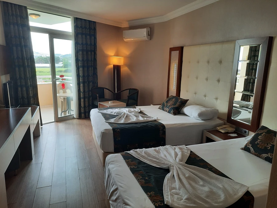 Номера в отеле свежие, так как в 2023 году была проведена реновация — обновлены ковролин, мебель, сантехника и техника. Семейные номера с видом на море — это отличный вариант для большой семьи, так как они достаточно просторные. 🛏️ Бесплатный Wi-Fi на всей территории отеля и бесплатный мини-бар с 2 бутылками воды и 2 соками ежедневно — приятные бонусы. 🍹 В номерах есть балконы, что добавляет удобства. Тапочки и халаты по запросу. 👘