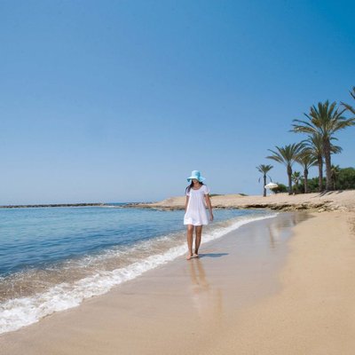 Пляж небольшой, песчаный на берегу и каменистый на входе. Лежаки, зонты, полотенца – бесплатно. Но, конечно, нужно учитывать, что пляжи на Кипре не принадлежат отелям – они именно городские.