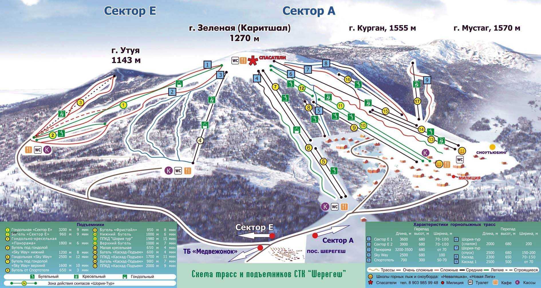 Зеленые трассы. Для новичков рекомендованы нижние части (выкат) трасс "Рыжая" и "Лоб". А также для семейного туризма отлично подойдет трасса "Медвежонок", которая находится в 10 км от Шерегеша и является полноценным самостоятельным комплексом со своей инфраструктурой.